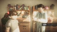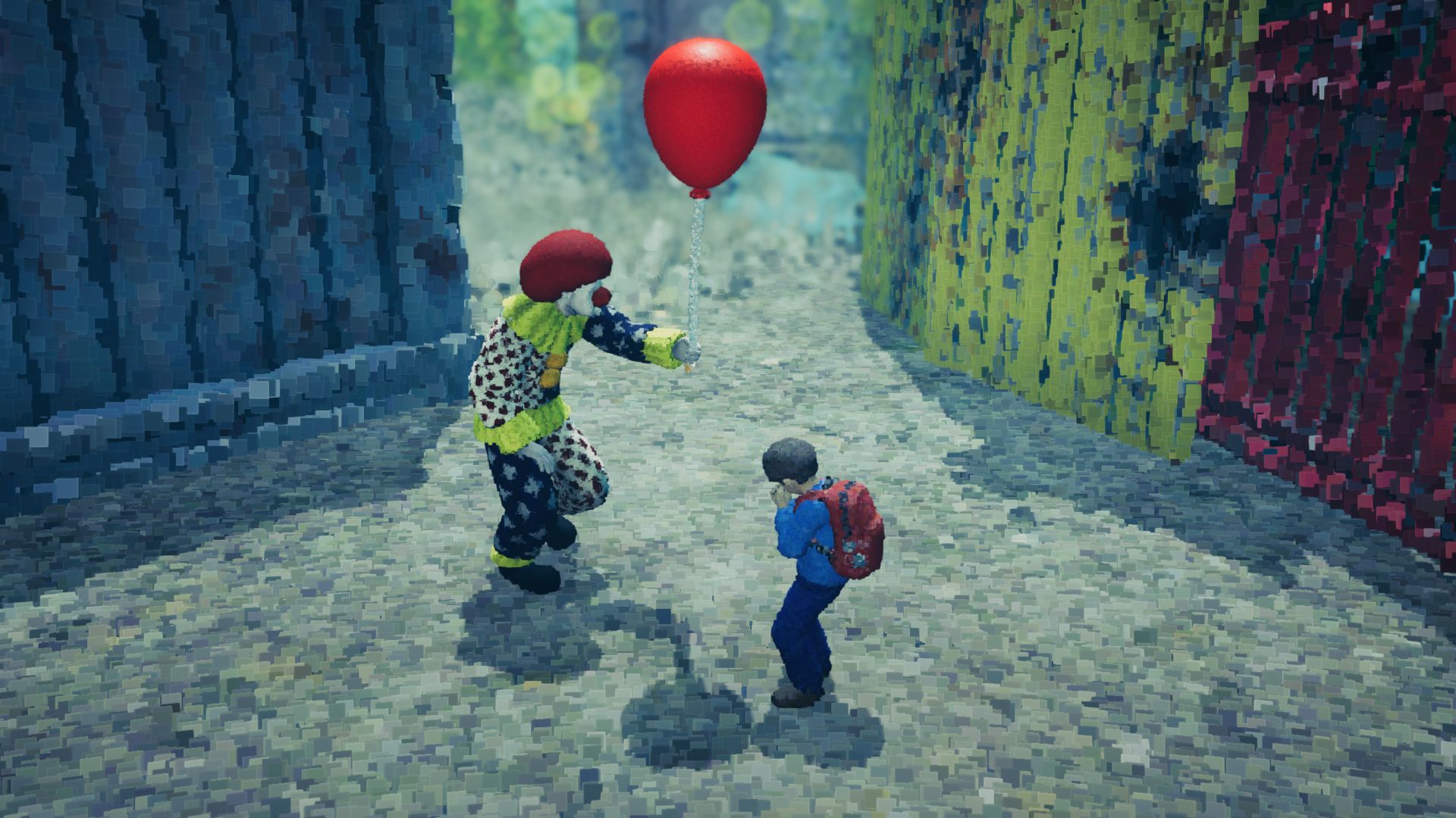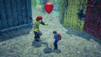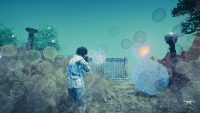 Some objects drop a blue fluid which lets us hear their feelings and clears the immediate area for good. Otherwise, we have to shoot the constantly returning pixel masses again to be able to move around. Lost auras also need to be shot in order to calm down and help us on our current quest. Once the manhole cover is emotionally receptive again, we’re able to descend to a family of moles who aids us in fulfilling a local boy’s troubled by problems in his family final wish before moving: to hear the enchanting piano one last time. During a visit from an important client, we help the aforementioned clown restore decommissioned rides at Heaven’s Door amusement park. To do this, we shoot down the gondolas of a ferris wheel or the cups of a coffee cup carousel.