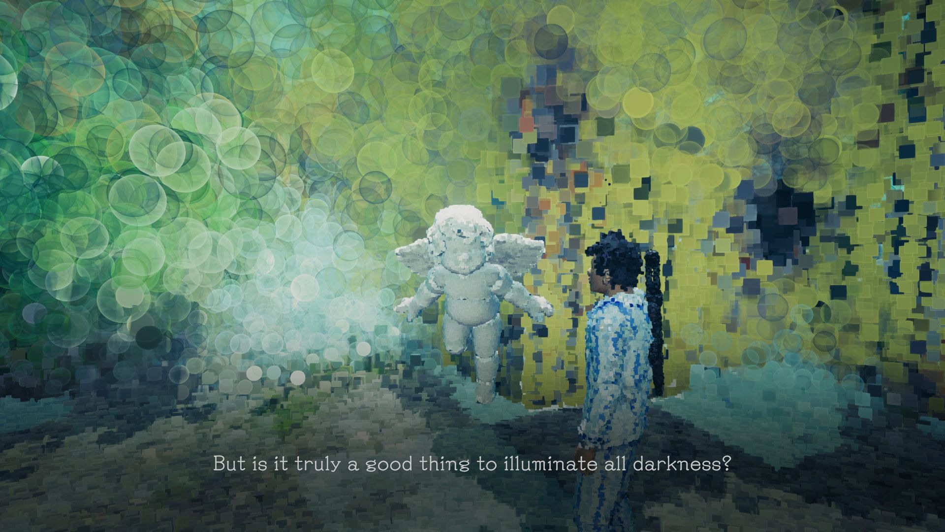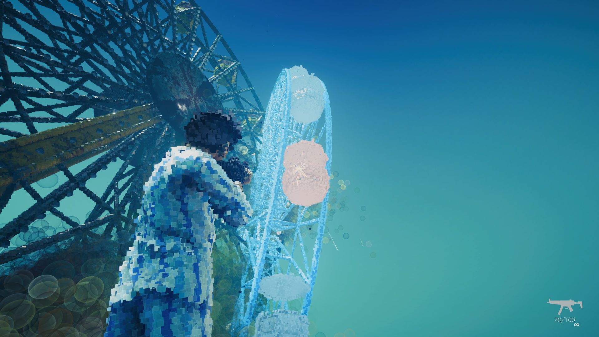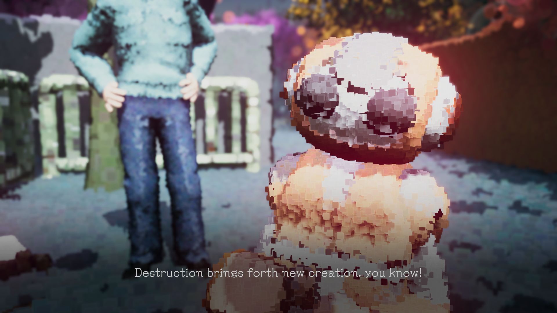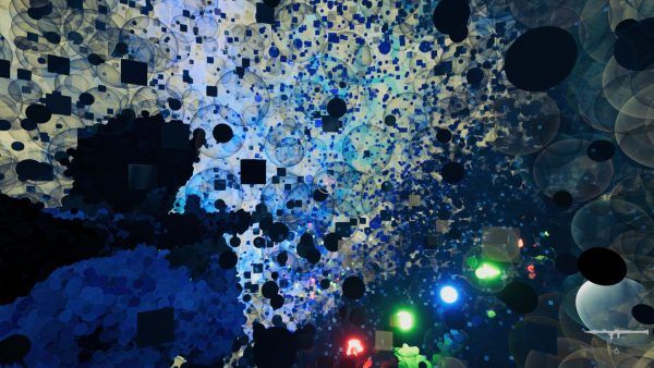 The world of Dreams of Another is abstract by design and combined with its it’s low-poly models made up of large numbers of individual pixels and the game’s watercolor optics, Q-Games manages to create very unique visuals. In 3rd-person view, The Man in Pajamas uses his machine gun to shoot everything in his way to materalise the world around him – creation through destruction. On your journey, you encounter no less than 190 unique objects, all of which have a soul called Aura. They tell us of their needs, worries, and dreams. A vending machine directs their complaint onto us regarding noisy coins, angel statues utter things you may find inside a fortune cookie, only to challenge their validity immediately, and a group of crates worries about their reputation, as they look a bit intimidating. The amusement park’s manager dressed in a clown’s costume decided to wrap yellow and black tape around them, after all they contain toilet paper. We can also take a listen to these sentiments again via the menu.