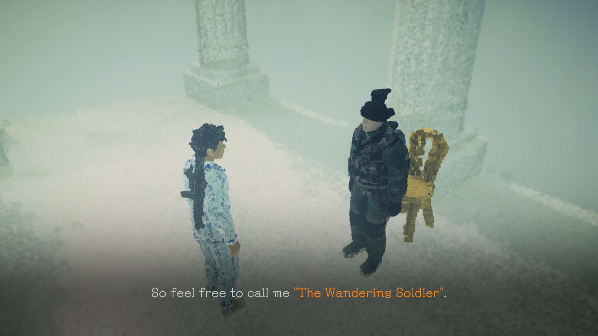 While all of the side content explores interesting themes such as the definition of art and some content is pretty bizarre or hilarious at times, the main story takes on a more serious tone. In the middle of a war zone, The Wandering Soldier can’t bring himself to shoot another person which results into him getting wounded and suffering psychologically from the consequences of war. As the game progresses, The Wandering Soldier asks us elemental questions, and depending on our answers, the game world may treat us differently. He wants to know when we come to the conclusion to throw things away, and we can reply by waiting until they’re broken, they became useless, or when we feel like it. In a handful of playable flashbacks, we experience formative moments for the two protagonists in sometimes heartbreaking moments, such as the soldier bidding farewell to his one true love, or a young Man in Pajamas growing fond of a stray cat. The ending brings the game to a close, but still leaves some questions unanswered. In New Game+, we retain our progress of acquired upgrades, unlocked tips and sentiments, the collected odds and ends, and our ammunition.