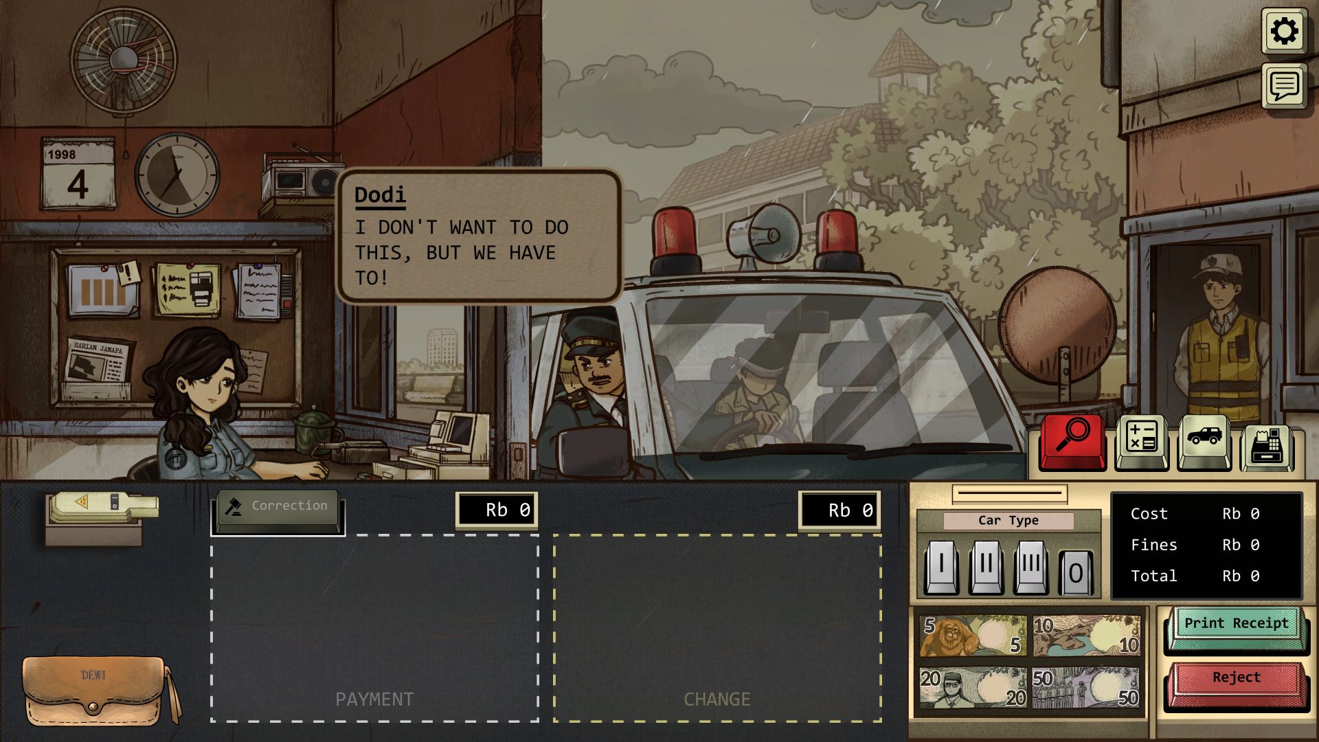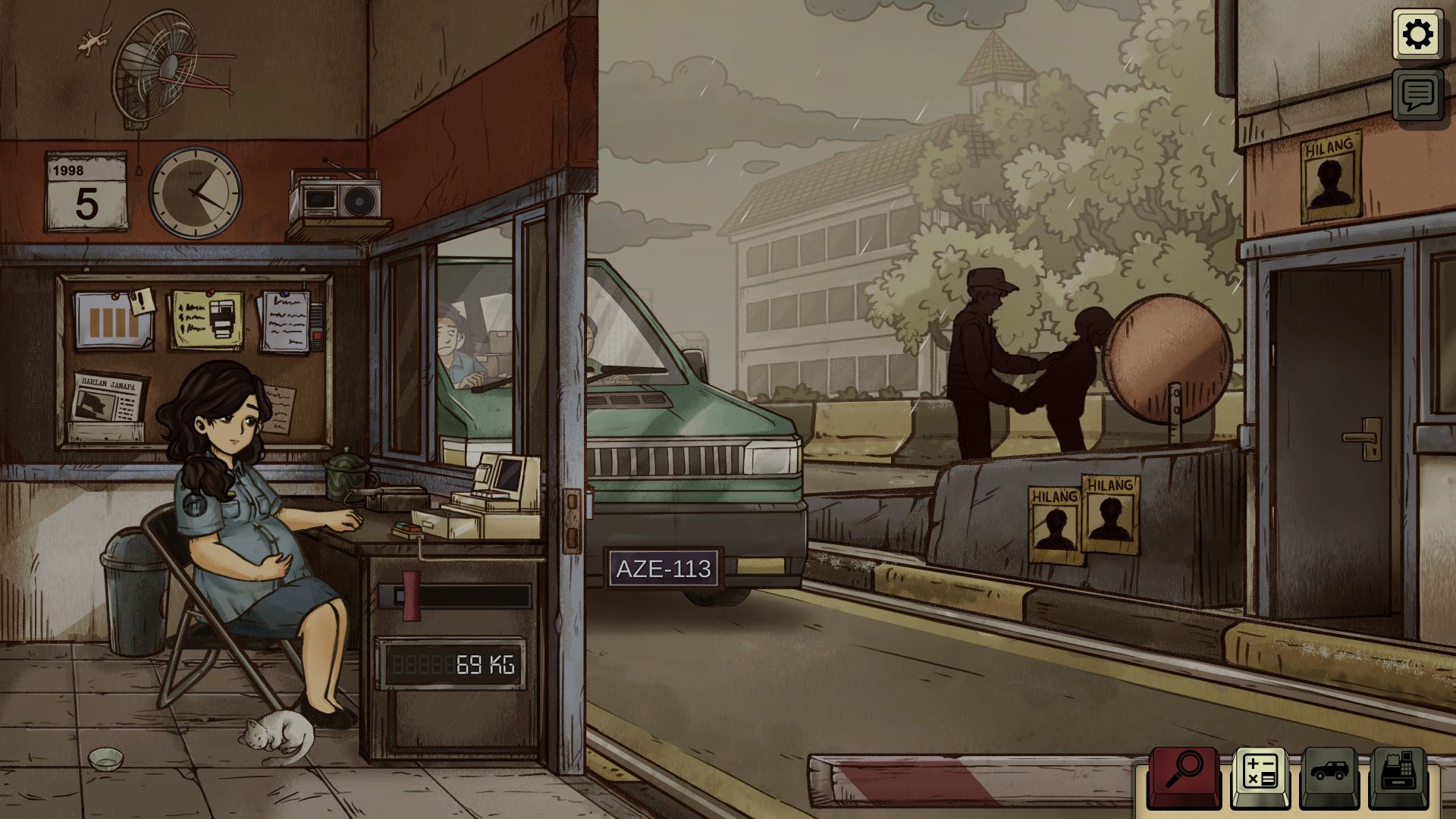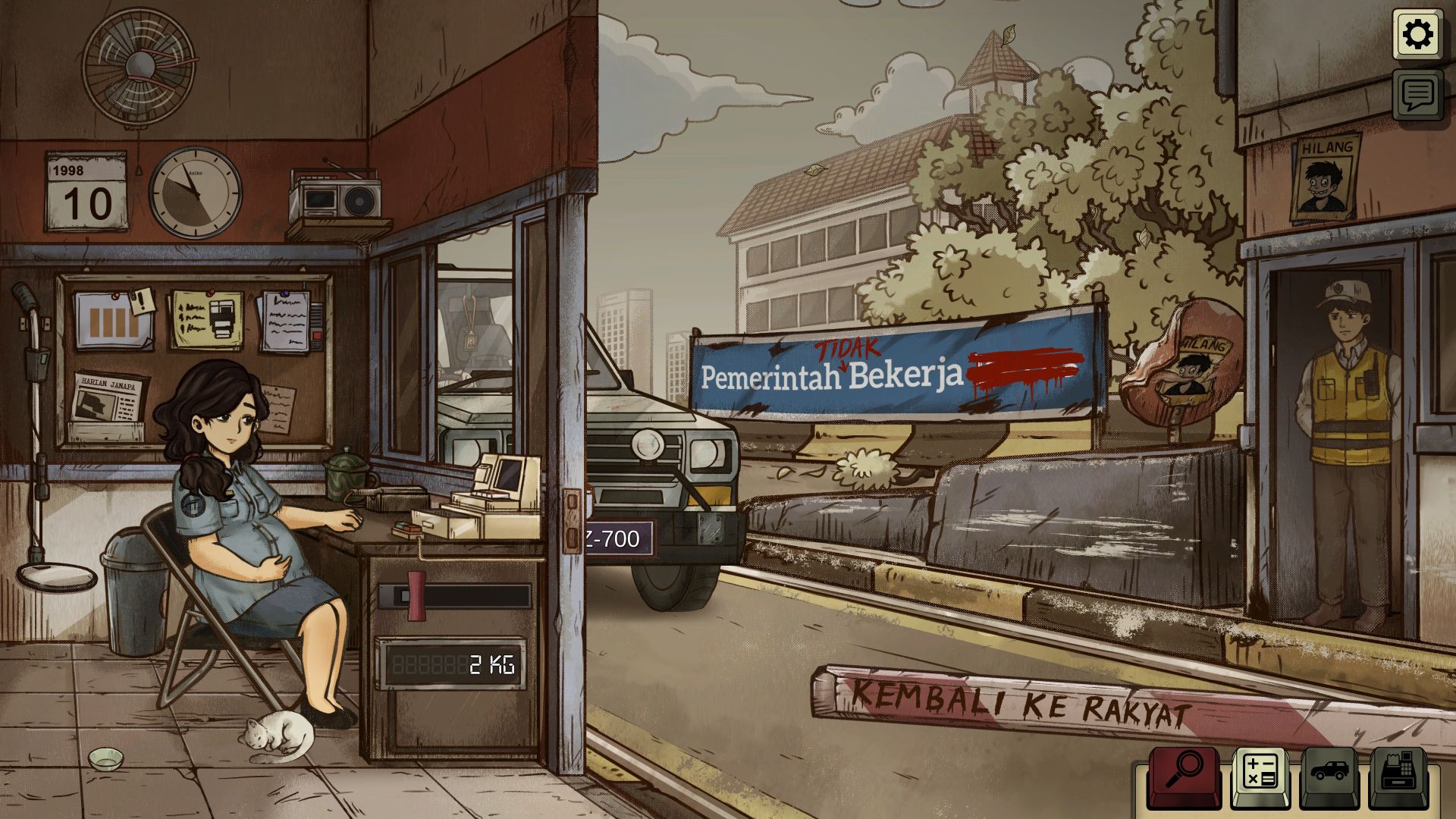 The game was developed by GameChanger Studio, based in Tangerang, Indonesia, and it is based on the Indonesian riots of May 1998 (also known as Peristiwa 98), which claimed the lives of more than 1,000 people. The story is advanced through newspaper articles, which depict the escalating violence and how the state apparatus attempts to downplay the events. At the toll booth, we can influence the events to a certain extent. The shift has a fixed length, but the tasks become increasingly varied. While initially we only have to determine the correct vehicle class, occasionally get to pet our cat, which we can name ourselves, listen to the handful of songs on the radio, and collect the appropriate toll, the regime becomes increasingly restrictive. Soon, we are instructed to turn away small vehicles carrying demonstrators and to collect fines for smuggled goods (we use a metal detector to detect firearms, knives, and explosives), overweight vehicles, discrepancies in paperwork, and worn or fake license plates. If we discover counterfeit money with an UV lamp, a fine doesn’t suffice, and we are obligated to call the police.