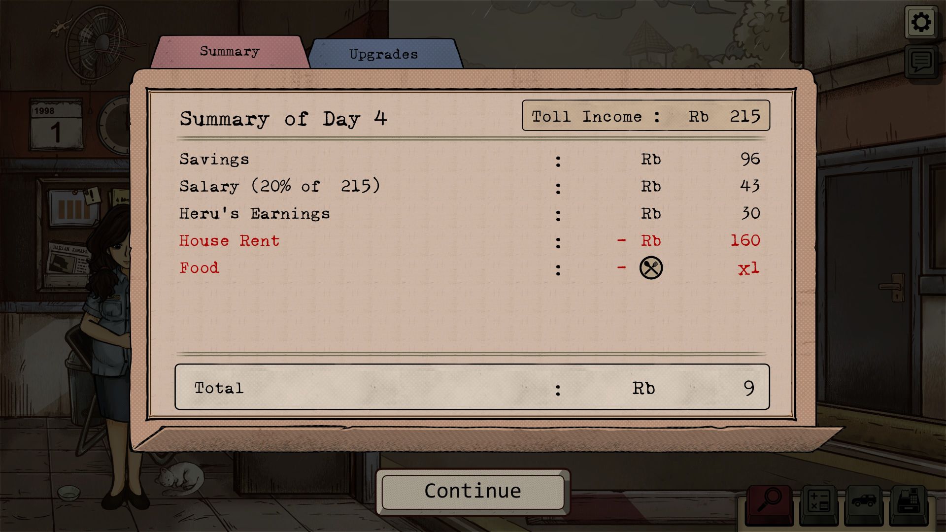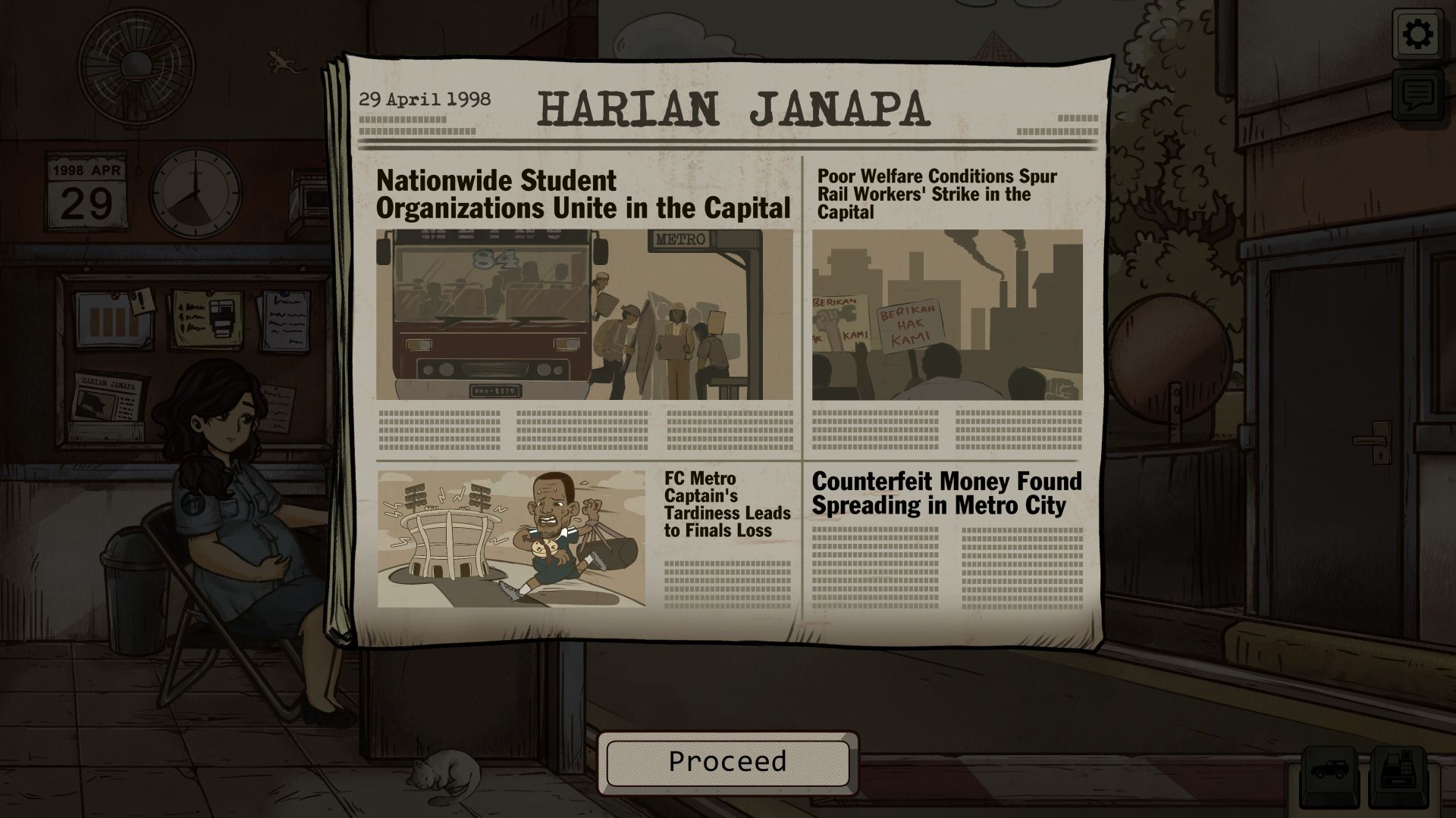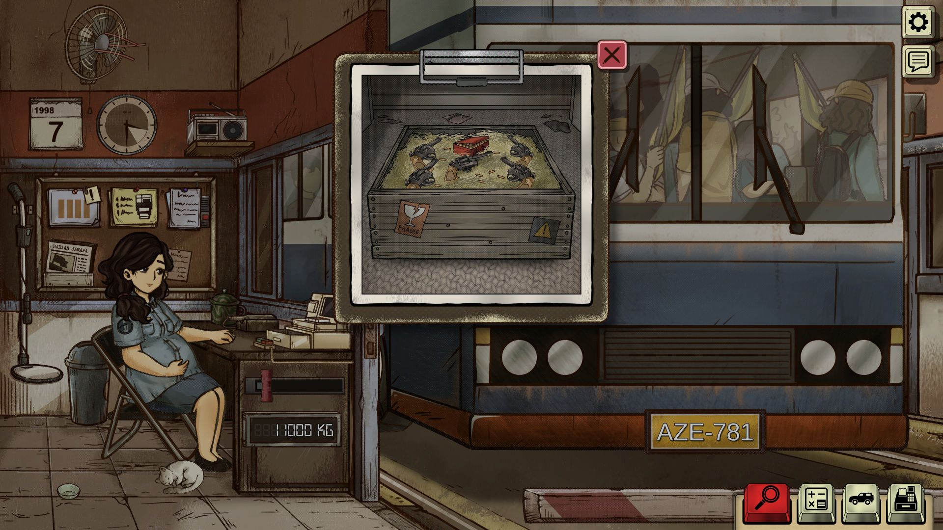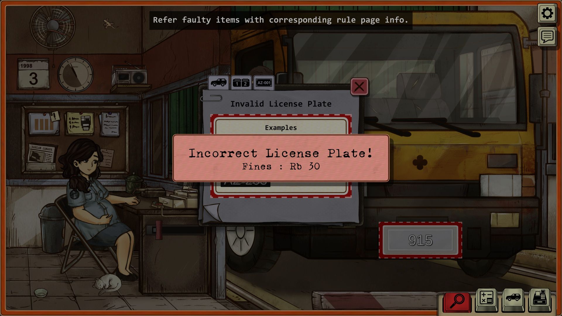 The game was developed by GameChanger Studio, based in Tangerang, Indonesia, and it is based on the Indonesian riots of May 1998 (also known as Peristiwa 98), which claimed the lives of more than 1,000 people. The story is advanced through newspaper articles, which depict the escalating violence and how the state apparatus attempts to downplay the events. At the toll booth, we can influence the events to a certain extent. The shift has a fixed length, but the tasks become increasingly varied. While initially we only have to determine the correct vehicle class, occasionally get to pet our cat, which we can name ourselves, listen to the handful of songs on the radio, and collect the appropriate toll, the regime becomes increasingly restrictive. Soon, we are instructed to turn away small vehicles carrying demonstrators and to collect fines for smuggled goods (we use a metal detector to detect firearms, knives, and explosives), overweight vehicles, discrepancies in paperwork, and worn or fake license plates. If we discover counterfeit money with an UV lamp, a fine doesn’t suffice, and we are obligated to call the police.