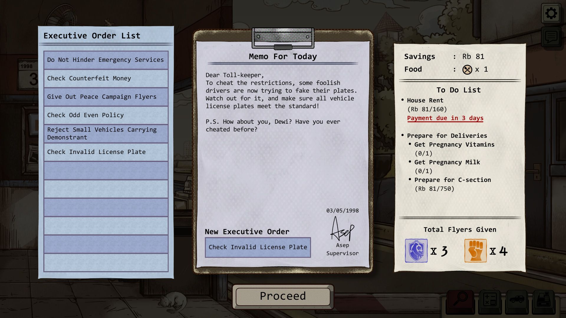 To raise the necessary funds for a C-section, pregnancy vitamins, and pregnancy milk, we can earn some extra cash by selling flyers for the regime or for the protests. Watch out and don’t hand a flyer for the student movement to the wife of an official of the authoritarian regime or she’ll denounce you. On the other hand, we can also use our income to help those in need make ends meet or escape. If we turn away the captain of the Metro FC football team for not paying the toll, as per the rules, the newspaper will report on the team’s defeat the following day. If we overlook something—whether intentionally or not—the cost will be deducted directly from our wages. Since the rent is also steadily increasing, we have to manage our income carefully, and the game presents us with some tricky moral decisions.