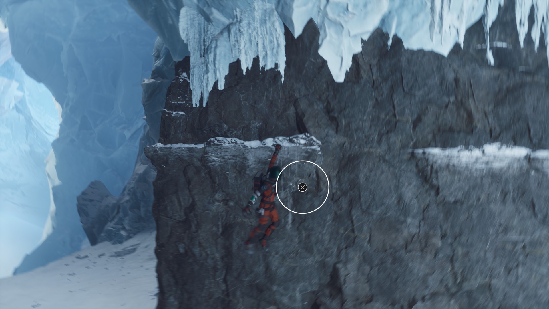 In the later chapter, Ariane approaches the Source, the true destination of the scientific expedition. She searches for a way out beneath a thin layer of ice, climbing icy mountains and squeezing through narrow caves. Here, Ariane encounters an alien life form, also known as Nemesis, which seems to have been following her for some time. Nemesis can’t see her, only hear her. In a nerve-wracking sequence, which is surprisingly short, we sneak past the patrolling monster. With her electromagnetic scanner, Ariane can detect radio waves and repurpose them to manipulate the environment, thus opening up new areas for the grappling hook.
