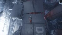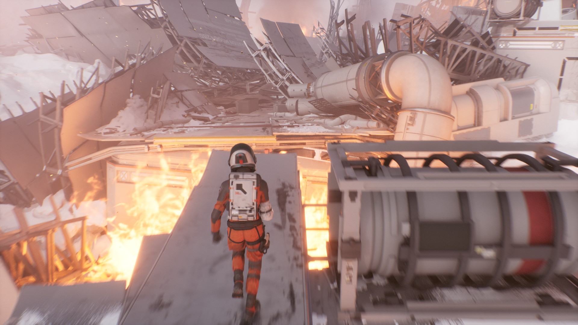 Using our Pathfinder—a kind of Pip-Boy on Ariane’s arm—we find a way out of the wreck. We really get a sense of the space shuttle’s dimensions, as we dodge falling debris on sliding sections and use the grappling hook to climb steep ledges, while swinging to new platforms with its rope. The controls are all quite intuitive, and the individual areas of the shuttle around the rover are impressively presented.
